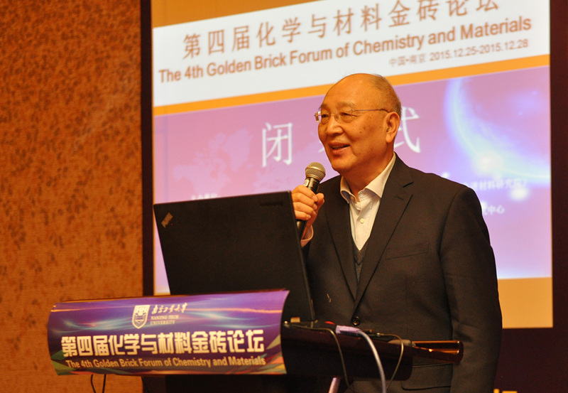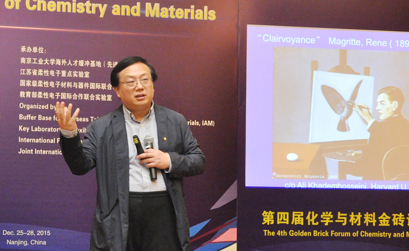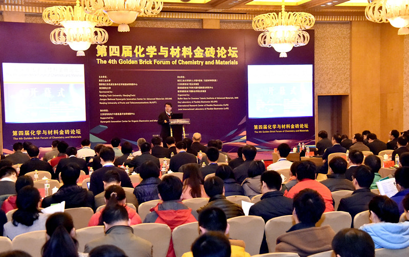 The 4th Golden Brick Forum of Chemistry and Materials was held in Nanjing Tech University from 25th to 28th December, 2015. The Academician and President Huang Wei, Academician Zhang Xi from Tsinghua University, Academician Yan Deyue from Shanghai Jiaotong University and Academician Jiang Lei from Technical Institute of Physics and Chemistry CAS were chairs and co-chairs of this Forum. The 4th Golden Brick Forum was sponsored by Nanjing Tech University, Jiangsu National Synergetic Innovation Center for Advanced Materials (SICAM) and Nanjing University of Posts and Telecommunications (NJUPT), organized by Buffer Base for Overseas Talents (Institute of Advanced Materials), Key Laboratory of Flexible Electronics (KLOFE), International Research Center of Flexible Electronics (CoFE) and Joint International Laboratory of Flexible Electronics (LoFE), supported by Synergetic Innovation Center for Organic Electronics and Information Displays.