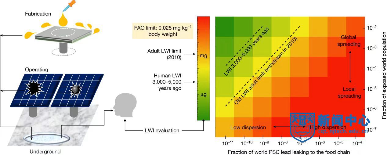 铅基钙钛矿太阳电池在新能源领域展现出极大的应用潜力,而铅元素潜在的环境危害性将成为其产业发展的瓶颈。虽然钙钛矿光伏组件中铅元素的重量占比较低,但由于铅离子较高的生物兼容性,组件中极小比例的铅进入食物链即可超出联合国粮农组织设定的人均每周铅摄入量上限,从而危及人类健康(图1)。