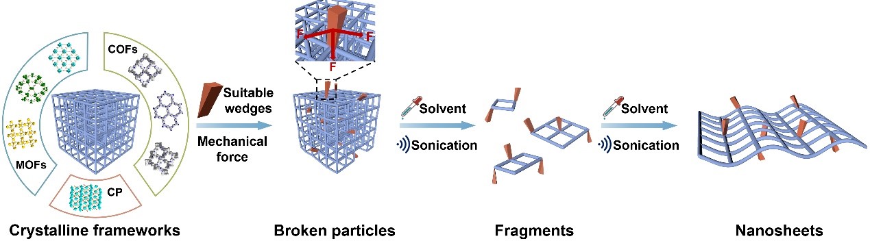 为此,团队报道了一种在三维框架类晶体中打楔子的策略,通过楔子分子辅助机械力劈开三维框架类晶体并将其转化为纳米片。其中,与框架类晶体中单体具有相同相互作用基团的楔子分子被楔入到框架类晶体中,使机械力定向传输来破坏化学键。该策略具有普适性,可以将多种三维框架类晶体如金属有机骨架、共价有机骨架、配位聚合物等制备为纳米片。此外,具有特定基团的功能分子如荧光分子、手性分子和酶作为楔子分子制备的功能框架类晶体纳米片赋予了纳米片更多的性质,为探索纳米片的潜在应用带来了新的视角。该楔晶体策略具有可操作性、灵活性和可设计性等优点,有望拓展机械力化学在材料制备中的应用。