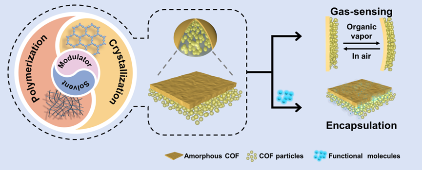 为此,团队开发了一种调节剂溶剂诱导策略,旨在调控COFs的生长平衡,从而形成COF薄膜并得到功能化的COFs膜。通过引入合适的调节剂,首先通过调节剂和对苯二胺之间形成氢键以减缓亚胺键的形成。随后,引入适当的干燥工艺,调节溶剂的蒸发速率与亚稳态非晶网络重构速率的平衡所得到的COFs薄膜表现出一种非晶网络与结晶多孔态相结合的非对称结构,并具备可逆的有机分子刺激响应驱动行为。此外,荧光、手性和催化分子等功能分子可以方便地封装进COFs基质中,赋予其额外的功能。