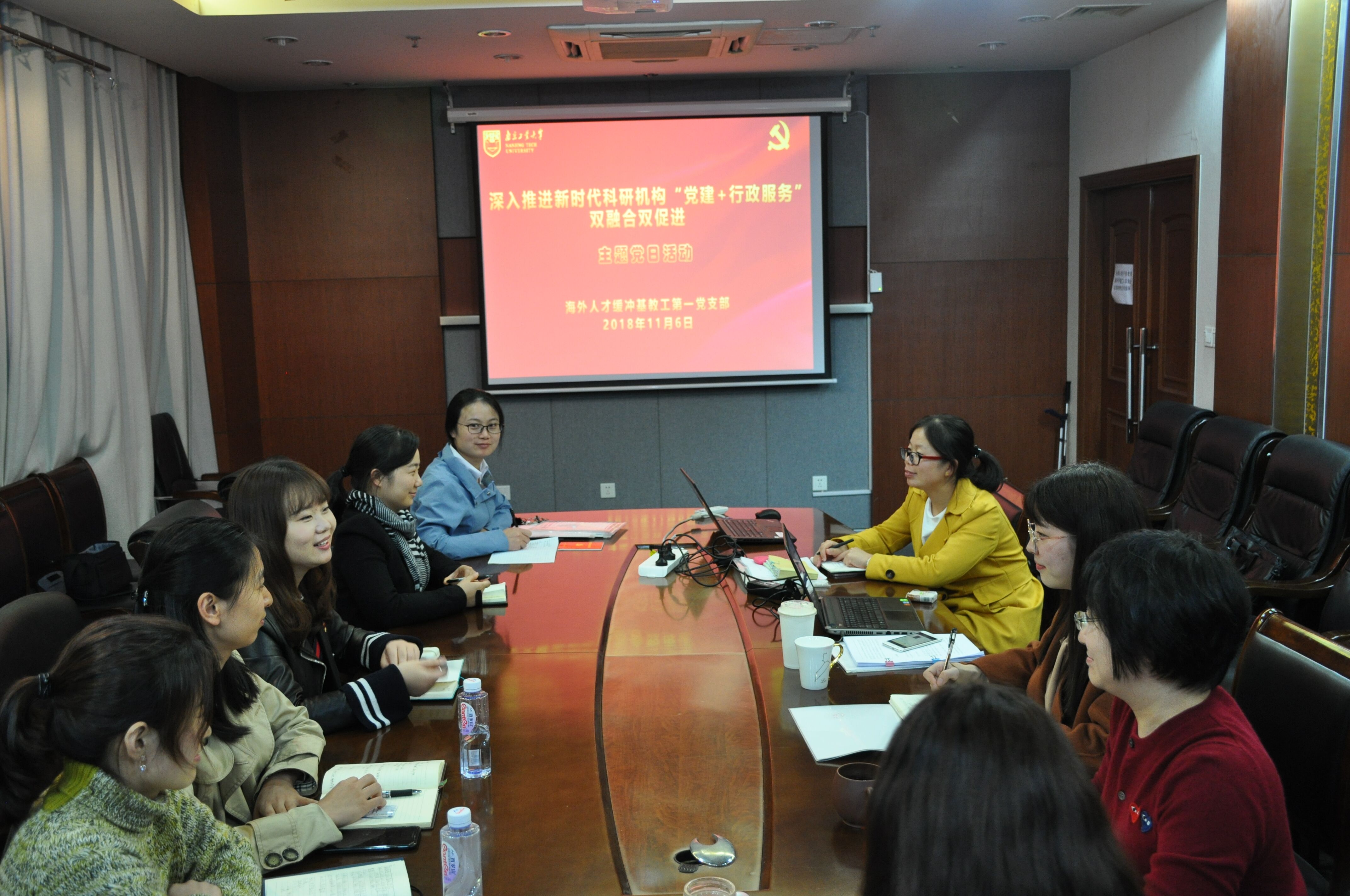 11月6日下午,海外人才缓冲基地教工第一党支部在科技创新大楼C503室举办深入推进新时代科研机构“党建+行政服务”双融合双促进主题党日活动,支部书记朱纯欣主持活动。