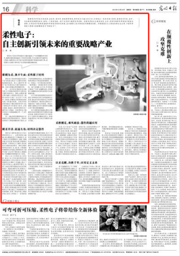当前,电子信息产业仍然以刚性器件和系统为主。经过近百年的技术积累,刚性器件具有成熟的加工装备、高运行速度、高精确性、高稳定性等优点。然而,经典硅基电子学的局限性受摩尔定律的影响日益突出。柔性电子的诞生为经典电子学的发展提供了新的方向,触发了新形态电子设备的产生,也将使人们的日常生活发生革命性的变化。如可折叠、可卷曲、柔性显示器将改变现有图片和影视的呈现形式,使得手机、电视等消费电子产品的形态更加新颖和轻便。