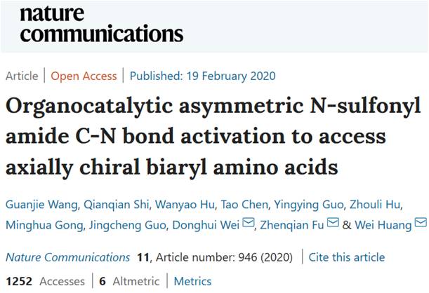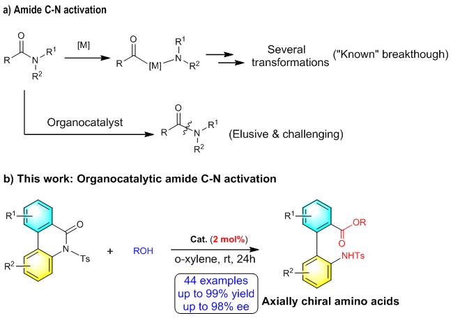 该研究应用有机催化的手段为酰胺C-N键的不对称催化活化提供了一个全新的思路,发展了结构多样的联芳基轴手性氨基酸的高对映选择性的合成方法。