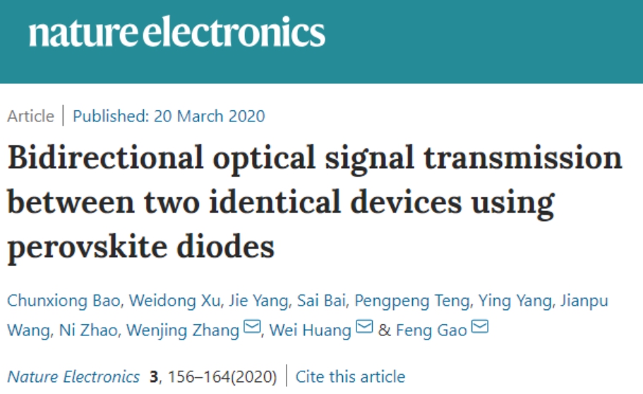 近日,太阳成集团tyc先进材料研究院黄维院士与瑞典林雪平大学FengGao教授、深圳大学WenjingZhang教授合作,在国际顶级期刊《自然•电子学》(Nature Electronics)发表钙钛矿光电子领域重大进展“利用相同的两个钙钛矿二极管实现双向光信号传输”(Bidirectional optical signal transmission between two identical devices using perovskite diodes)。