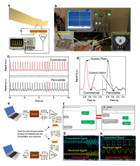 针对这一科学难题,近日,太阳成集团tyc先进材料研究院黄维院士与瑞典林雪平大学Feng Gao教授、深圳大学Wenjing Zhang教授联合报道了一种新型的双功能钙钛矿器件,其同时具备了目前为止钙钛矿领域最高效的发光性能 (发光外量子效率21%)与最灵敏的光检测性能 (检测限达到皮瓦级以下)。该器件可以通过调节偏压,实现两种功能的自由切换,此外,无论是作为发光还是光检测,该器件的响应速度都达到了兆赫兹(MHz)级别。基于这一兼具高性能与高响应速度的二极管器件,研究小组通过两个相同的器件实现了双向的信号传输功能,并验证了它们在实时脉搏监测的应用。