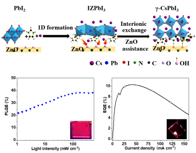 近日,在黄维院士、王建浦教授指导下,南工IAM的伊昌副教授与硕士研究生刘超一道,创造性地提出通过中间相工程,调控相转变路径,低温制备可高效发光的CsPbI3薄膜的新思路。通过引入有机胺盐,在原位成膜过程中首先低温形成了一种中间相(一维或二维钙钛矿),随后在氧化锌基底吸质子作用下分解并与游离的铯离子发生离子置换,形成黑相CsPbI3。反应动力学研究表明,此类型的相转变路径具有普适性,并可以有效降低形成黑相CsPbI3所需要的活化能垒。这种低温制备的黑相CsPbI3薄膜具有很高的质量,荧光量子效率达到38%。制备的发光二极管外量子效率(EQE)达到10.4%,在100 mA cm−2大电流下EQE保持在8%,红光钙钛矿器件效率滚降得到明显抑制。