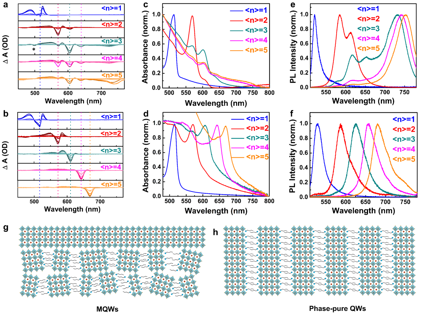 使用传统的碘化丁胺(BAI)和乙酸丁胺(BAAc)离子液体作为间隔阳离子源实现不同量子阱宽度的二维层状钙钛矿薄膜的光学性能表征(瞬态吸收光谱a,b;稳态吸收光谱c,d;稳态荧光光谱e,f)和结构示意图(g,h)