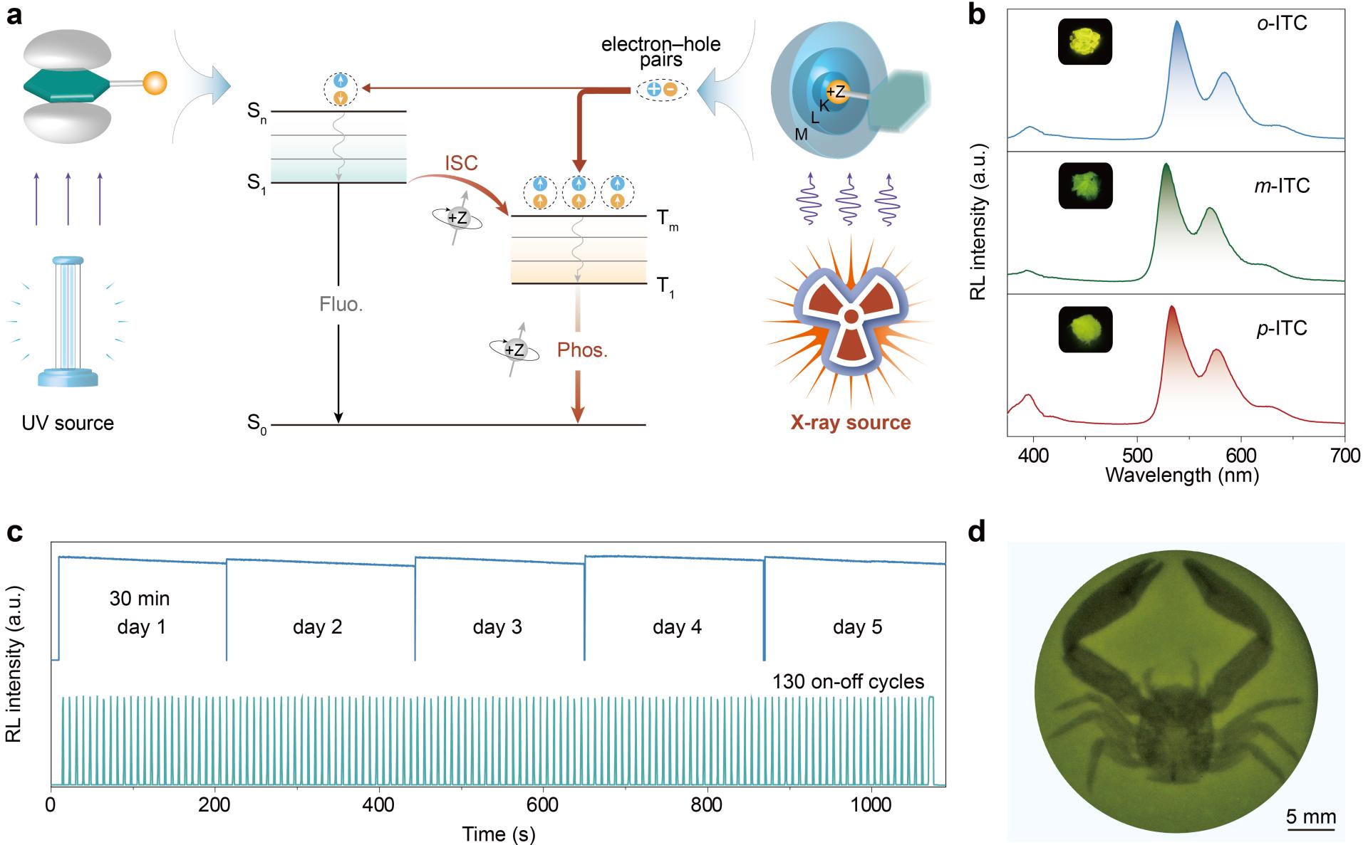 众所周知,闪烁体是一类吸收高能粒子或射线后能够发光的材料。X射线激发的闪烁体材料在辐射探测、安全检测、生物医学、国防******和X射线天文学等领域有广泛的应用。然而,高效闪烁体材料多为以陶瓷闪烁体为代表的无机材料,其制备受限于高温合成,且难以在柔性基底上实现大面积制备。由于不含金属的纯有机材料具有原材料储量丰富、机械柔性高、加工性能优、可大面积制备等突出优势。因而,有机闪烁体可作为闪烁体家族的全新材料,尤其是在柔性电子领域具有极大的潜在应用价值。但传统的纯有机材料主要由碳、氢、氮等质轻元素组成,对X射线的吸收较弱;另外,其弱的自旋轨道耦合作用导致有机发光材料在X射线激发下,三线态激子通常因跃迁禁阻而不发光,即只能产生源自于单线态的荧光发射。因此,生成比例达75%的三线态激子未被充分利用,限制了纯有机闪烁体材料的发展。因此,如何设计并实现高效的纯有机闪烁体是该领域面临的重大研究挑战之一。