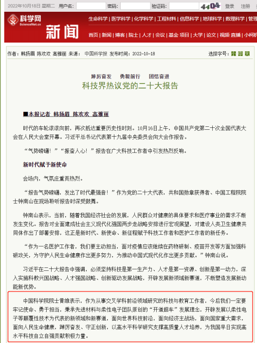 据《中国科学报》10月18日第1版新闻《踔厉奋发,勇毅前行,团结奋进|科技界热议党的二十大报告》(记者:韩扬眉 陈欢欢 高雅丽)报道: