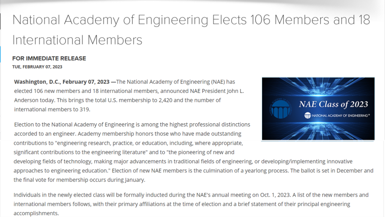美国工程院成立于1964年12月,是美国工程技术界最高水平的学术机构。当选美国国家工程院院士是工程领域专家的最高专业荣誉之一,以表彰入选者在工程研究、实践、教育等方面做出的重大贡献,在新兴领域技术做出的开拓性工作和传统工程领域中的重大贡献以及在开发实施工程教育方面的创新贡献。