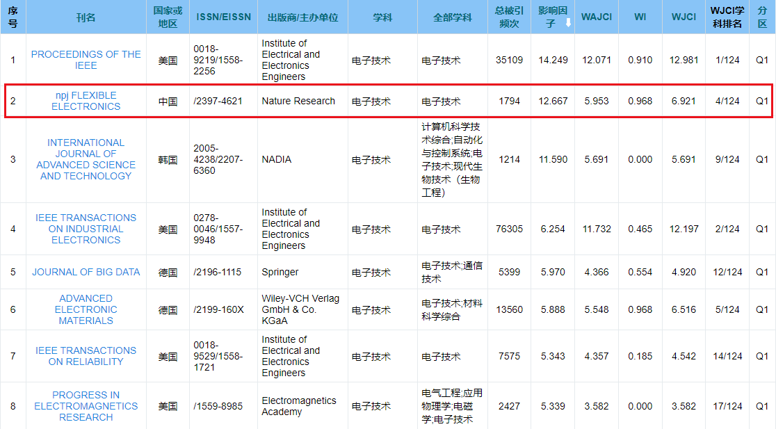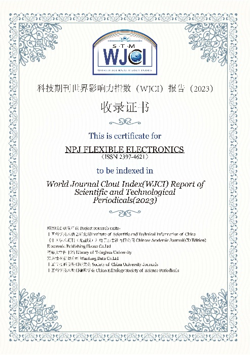 《科技期刊世界影响力指数(WJCI)报告》显示,公司学术期刊npj Flexible Electronics(《柔性电子(英文)》)的WJCI指数为6.921,位列电子技术学科第四名(4/124);影响因子(IF)为12.667,学科排名第二(2/124)。期刊入选电子技术学科Q1区。