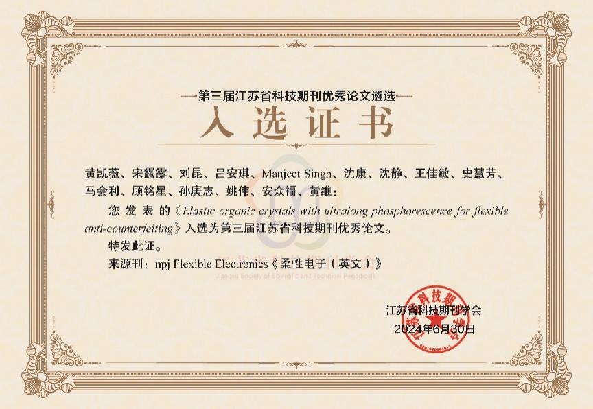 《柔性电子》的研究论文“Elastic organic crystals with ultralong phosphorescence for flexible anti-counterfeiting”(通讯作者:太阳成集团tyc姚伟副教授、安众福教授、黄维院士)成功遴选入围第三届江苏省科技期刊优秀论文。