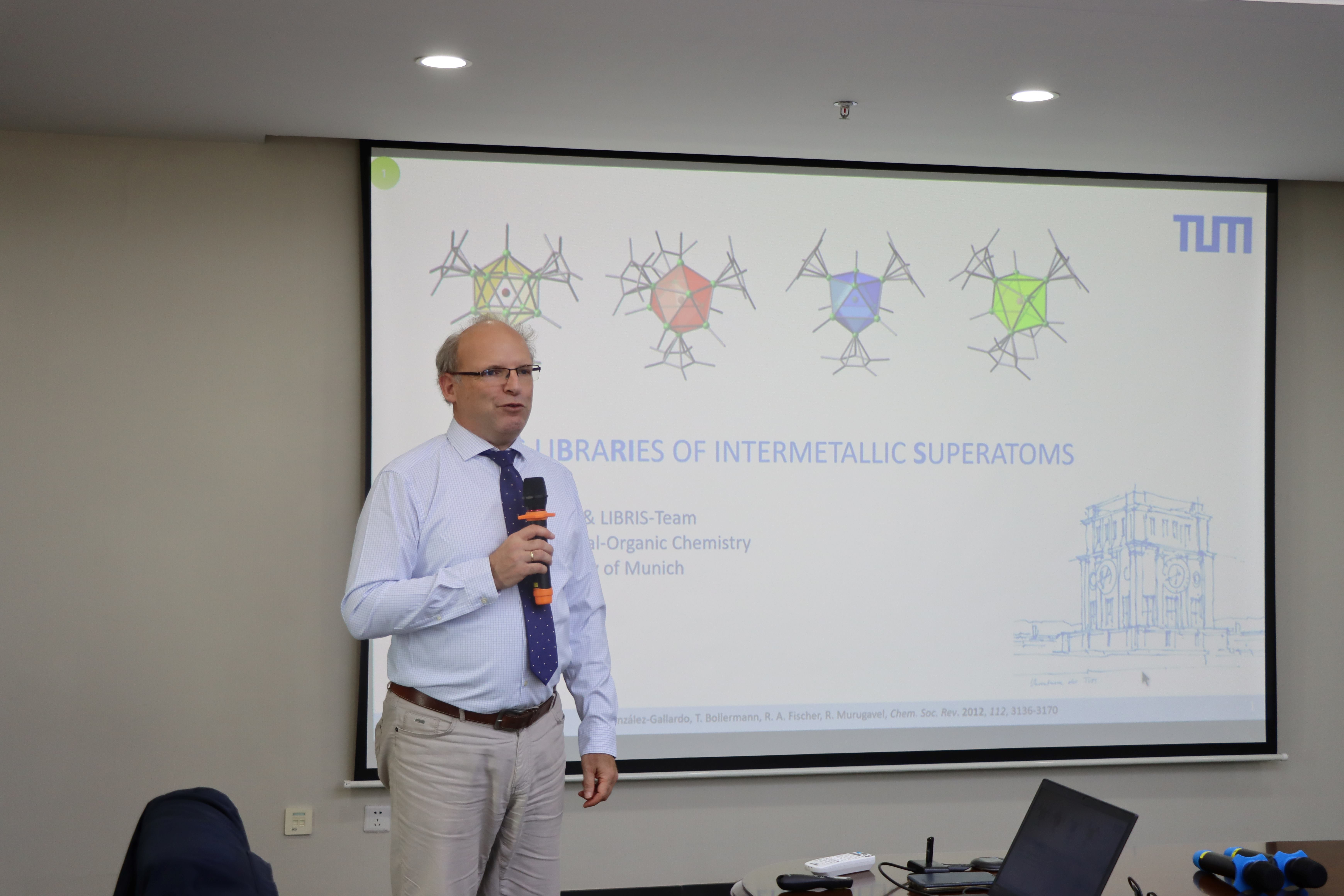 随后,Roland A. Fischer院士作题为Living Libraries of Intermetallic Superatoms的学术报告。Roland A. Fischer教授在报告中分享了其团队在超原子领域的最新科研进展,包括“超原子”理论设计、亚稳定的全氢碳连接簇和“超原子”团簇价态的电子结构等新理念和新方法。报告后,Roland A. Fischer院士与在场师生开展了积极的互动交流,气氛热烈,不仅开阔了在场师生的研究视野并启发创新思维,而且为公司师生如何结合自己的科研经历和学习背景,做最前沿且有较大应用价值的科研提供了非常行之有效的建议。