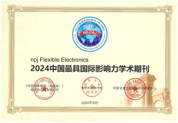 《中国学术期刊国际引证年报》(2024版)显示,公司国际学术期刊npj Flexible Electronics(《柔性电子(英文)》)的国际引证传播指数ICCI为145.950,国际他引总被引频次为2749次,国际他引影响因子为10.301,境外施引作者数为10307人次,成功入选2024年“中国最具国际影响力学术期刊”。