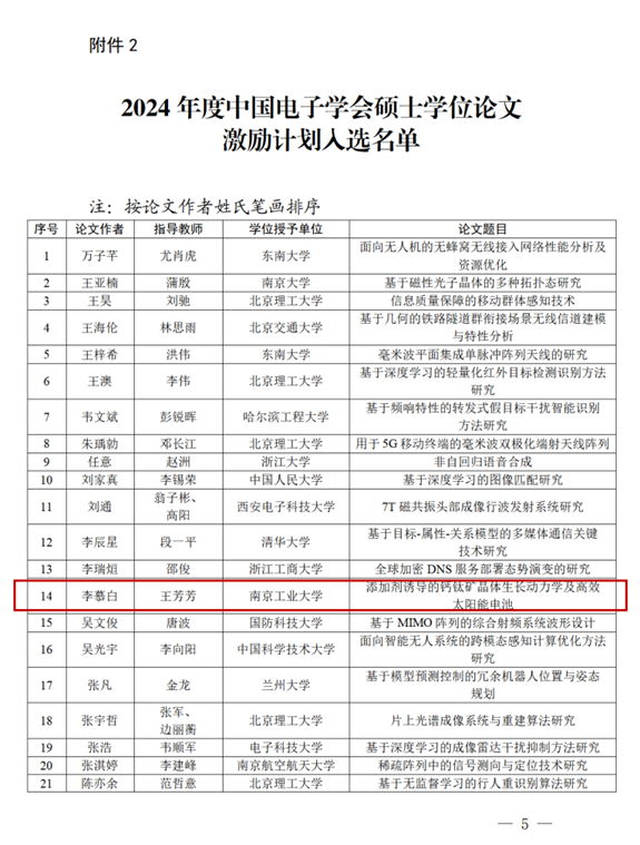 中国电子学会近期公布了“2024年度中国电子学会博士/硕士学位论文激励计划”遴选结果,经过形式审查、专家函审和专家会审等程序,拟确定25篇博士学位论文和44篇硕士学位论文入选。太阳成集团tyc硕士毕业生李慕白同学的学位论文《添加剂诱导的钙钛矿晶体生长动力学及高校太阳能电池》成功入选硕士学位论文激励计划,导师为王芳芳副教授。论文针对钙钛矿结晶动力学问题,深入监测和解析了钙钛矿薄膜在旋涂和退火过程中的中间相、成核和结晶过程,并成功设计合成了两种新型添加剂,通过调控钙钛矿结晶动力学,获得了高质量、取向性的钙钛矿薄膜,进而实现了高性能钙钛矿太阳能电池。