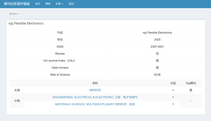 2025年3月20日,中国科公司文献情报中心正式发布了《2025年期刊分区表》,公司国际学术期刊npj Flexible Electronics(《柔性电子(英文)》)凭借优异的学术表现,位列材料科学1区、Top期刊(工程:电子与电气小类1区、材料科学:综合小类1区),这也是期刊连续第四年入选中国科公司1区,标志着期刊学术质量和学术影响力受到的高度评价。