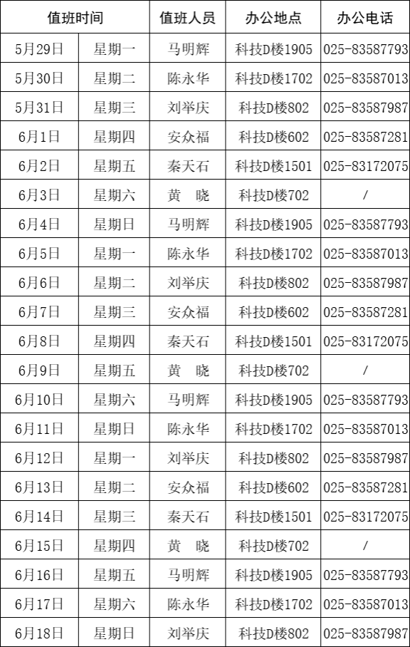 4.工作日期间值班时间为18:00-22:00,双休日(包括寒暑假)和法定节假日期间值班时间为8:00-22:00。