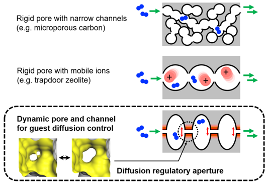 Design of the gas-diffusion process in a porous material is challenging because a contracted pore aperture is a prerequisite, while the channel traffic of guest molecules is regulated by the flexible and dynamic motions of nanochannels.[1-3]Herein, we present rational design of a diffusion-regulatory system in a porous coordination polymer (PCP) in which flip–flop molecular motions within the framework structure provide kinetic gate functions enabling efficient gas separation and storage.[4]The PCP shows significant temperature-responsive adsorption in which the adsorbate molecules are differentiated by each gate-admission temperature, facilitating kinetics-based gas separations of oxygen/argon and ethylene/ethane with high selectivities of ~350 and ~75, respectively. Additionally, we demonstrate the long-lasting physical encapsulation of ethylene at ambient conditions, owing to strongly impeded diffusion in distinctive nanochannels.