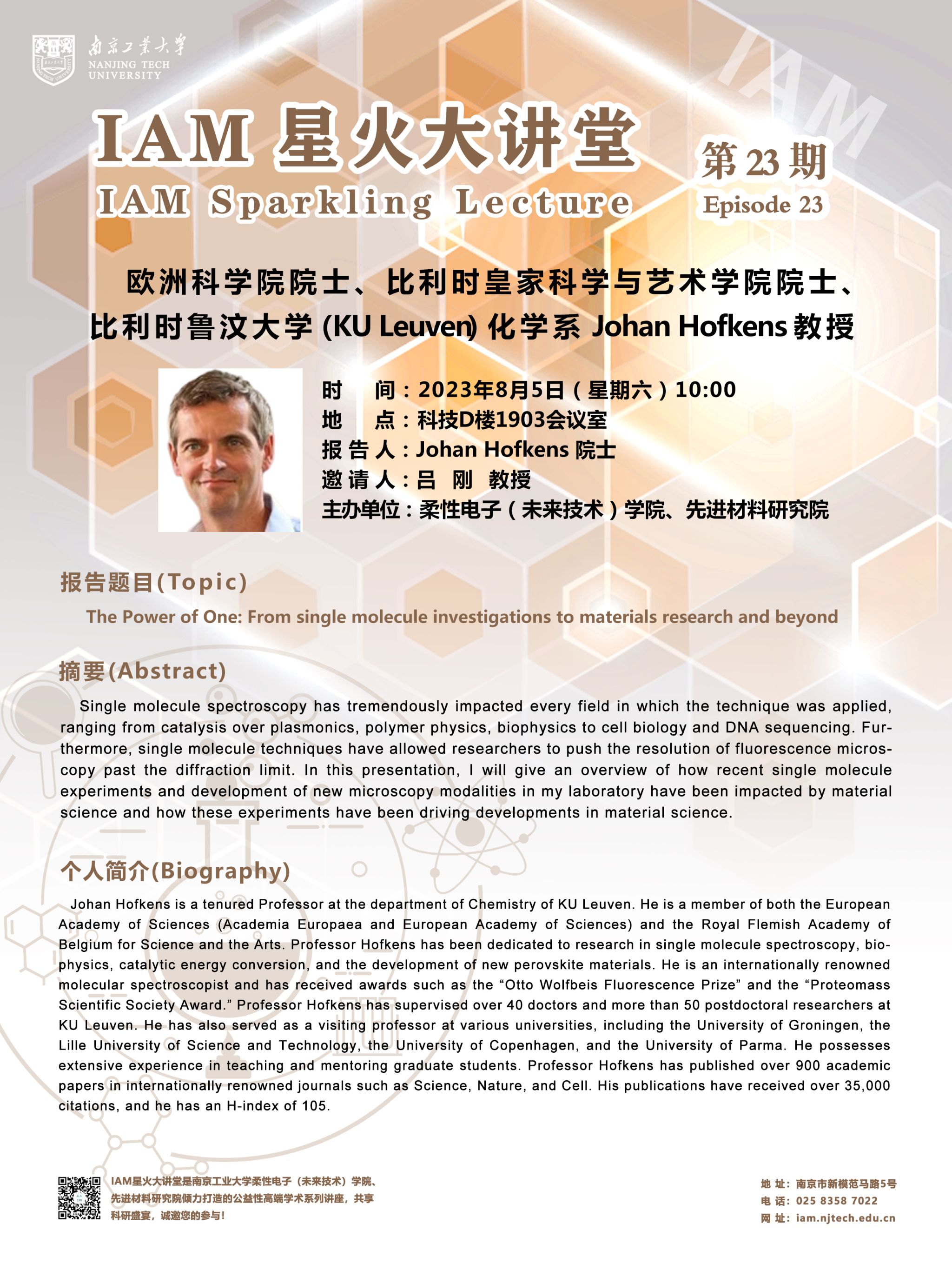 IAM星火大讲堂第23期:欧洲科公司院士、比利时皇家科学与艺术公司院士、比利时鲁汶大学(KU Leuven)化学系Johan Hofkens教授
